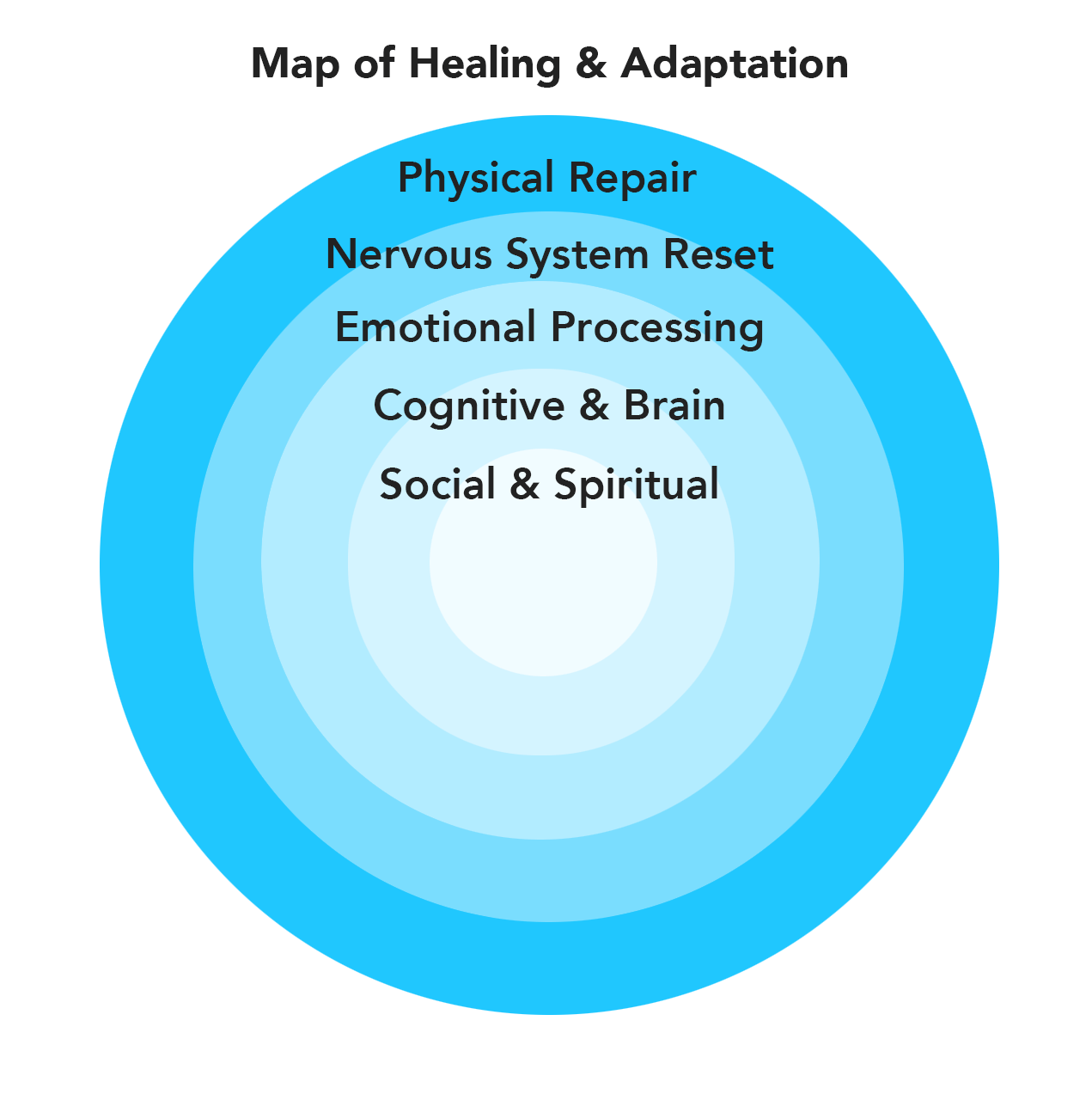 The above diagram is a layered map showing how healing and adaptation ripple outward from the Social & Spiritual to the Physical Repair dimensions.